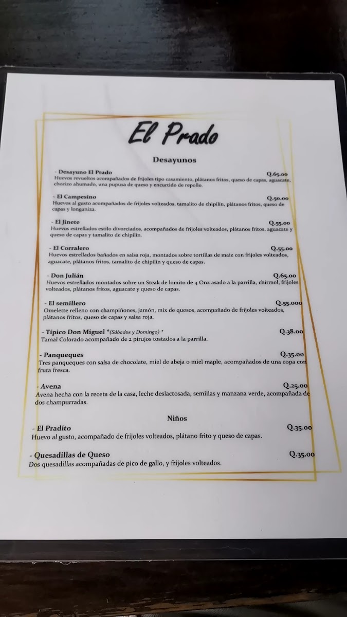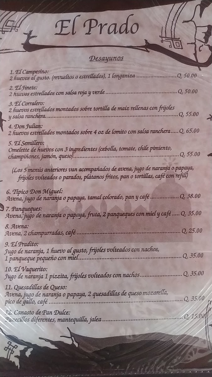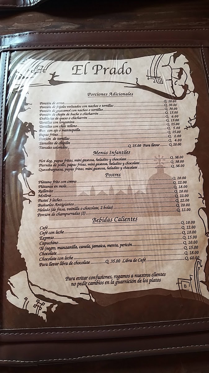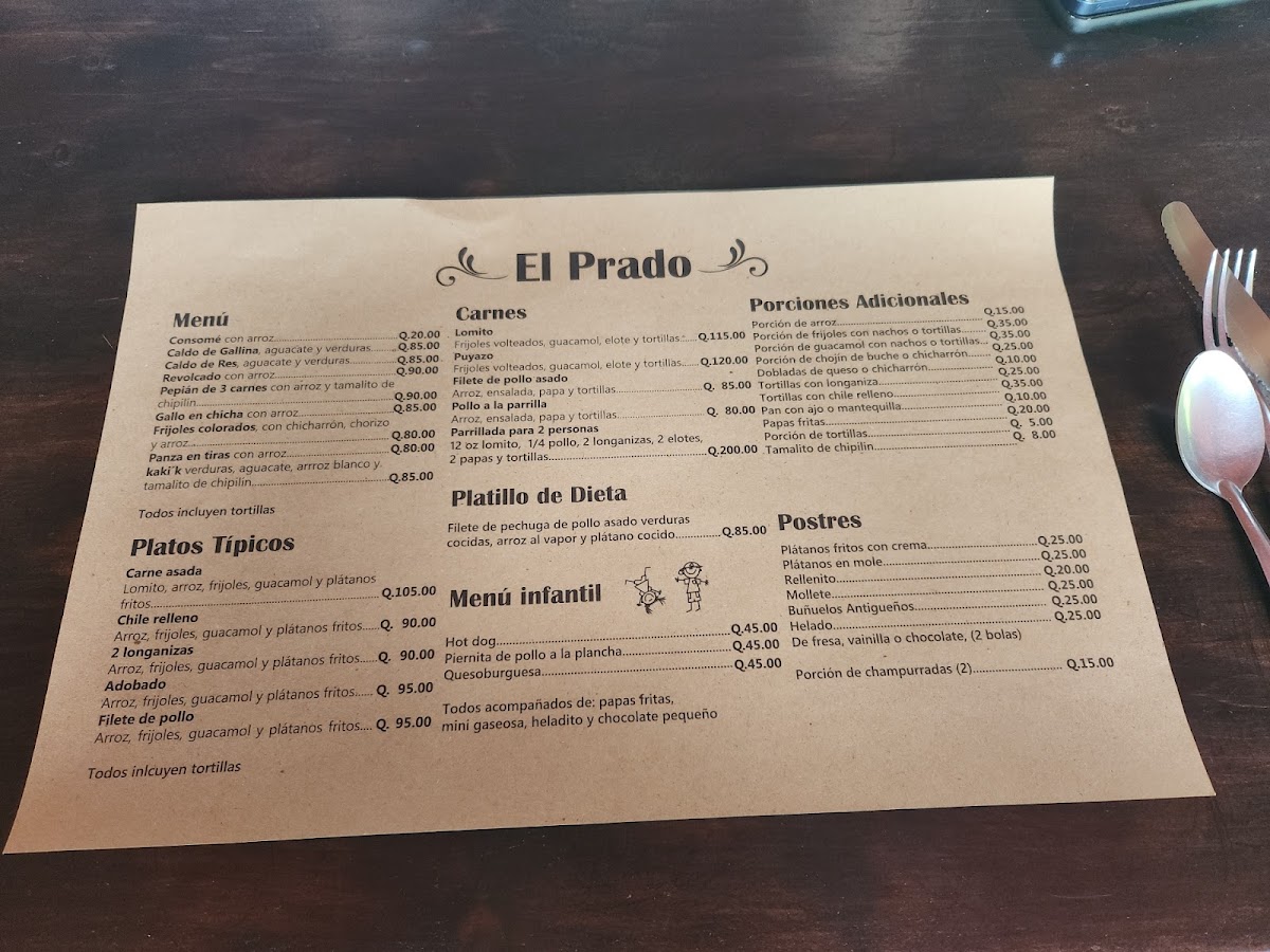 The menu at Restaurante El Prado in Antigua Guatemala offers a delightful array of traditional Guatemalan dishes, showcasing the region's rich culinary heritage. Among the standout dishes is Carne Adobada, a marinated beef dish that packs a flavorful punch, followed closely by the ever-popular Carne Asada, grilled to perfection. For those seeking something unique, the Pepian de 3 Carnes presents a rich, spicy stew made with a combination of meats, embodying the complexity of traditional Guatemalan flavors.