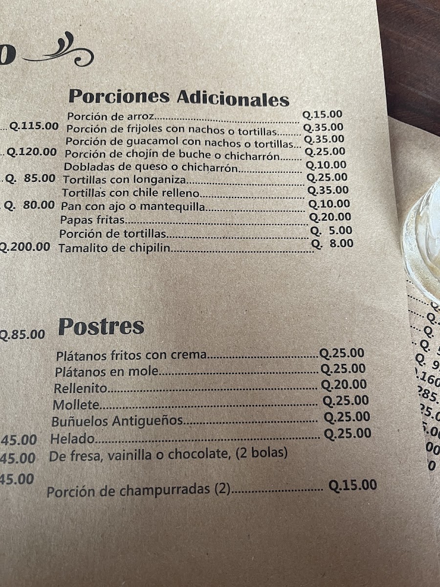 For a taste of the local sweets, Buñuelos Antigueños are a must-try, crispy fried dough balls drenched in syrup, offering a perfect balance of sweetness and texture. To pair with these hearty dishes, Fresco de Suchiles, a refreshing local drink, is the ideal complement. For something more substantial, the Churrasco Chapín-a flavorful grilled steak, accompanied by sides like Acompañamiento Arroz Aguacate Y Tamalito-a combination of rice, avocado, and tamale-provides a satisfying meal.